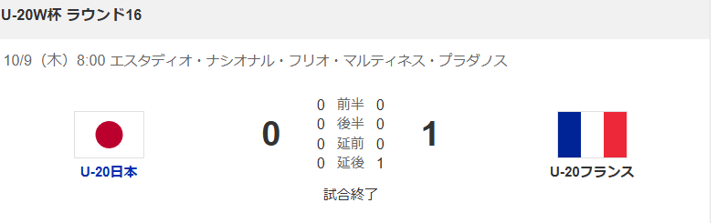 … | 9無題Name名無し 25/10/09(木)11:14:12 IP:153.246.*(ocn.ne.jp)No.554664+ 1759976052421.png-(15035 B) ![]() 日本 0―1 フランス |