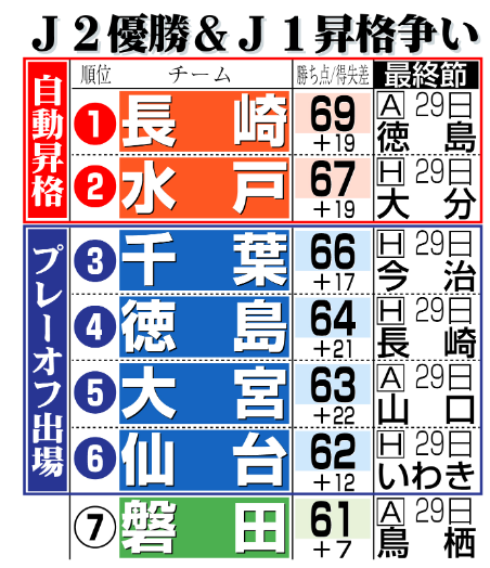 2位長崎が同66で迫る。次節23日は長崎の本拠地ピーススタジアムで