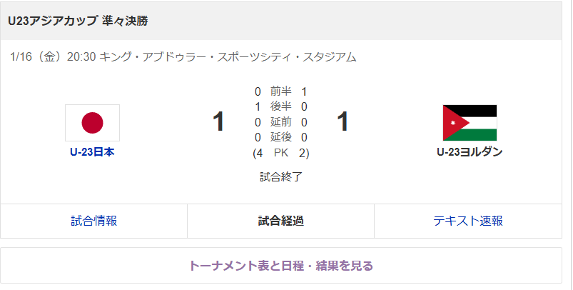 | … | 8日本、PK戦の死闘を制して準決勝へ。Name名無し 26/01/16(金)23:27:56 IP:153.246.*(ocn.ne.jp)No.554962+ 1768573676957.png-(27316 B) 日本は準決勝に進出し、オーストラリアvs韓国の勝者と対戦する。試合は日本時間1月20日(火)20時30分にキックオフを迎える。 |