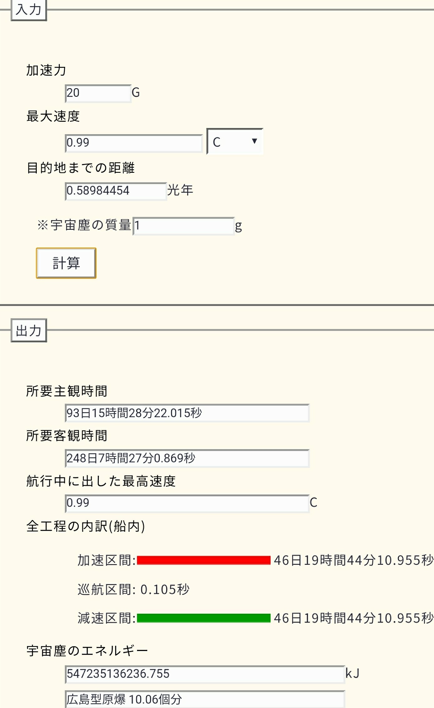 | … | 56無題Name名無し 26/01/26(月)17:25:59 IP:27.83.*(dion.ne.jp)No.1805530+>20G加速で光速の99%までの所要時間と、最高速度で1円玉に衝突した時の破壊エネルギーがこんな感じ |