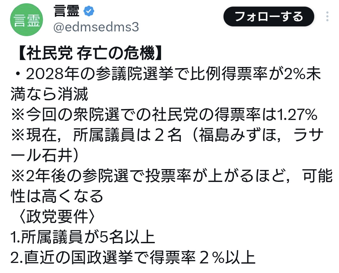| … | 2無題Name名無し 26/02/19(木)08:27:59 IP:106.155.*(au-net.ne.jp)No.4392802+ 1771457279921.jpg-(167865 B) 一応2031年まで猶予あるみたいですが政党要件の片方にリーチが掛かりました |