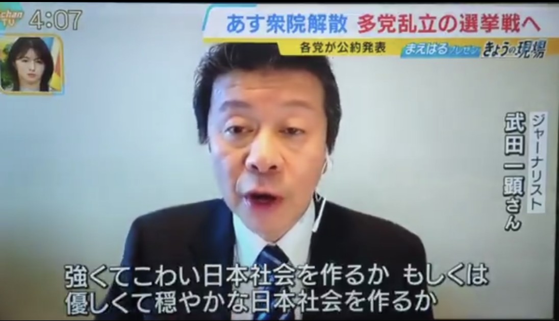 「(22日に)衆議院選挙についての放送をいたしました。そのなかで各党の公約を説明して、みなさんが投票する時どのように考えたらいいかをできるだけ分かりやすくお伝えしようという企画でした。よんチャンTVではジャーナリストの武田一顕さんに事前に聞き取りをしてそれをもとに画面を作って放送しました。スタジオに武田さんはいませんでした」とメイン司会の河田直也アナウンサーが説明。