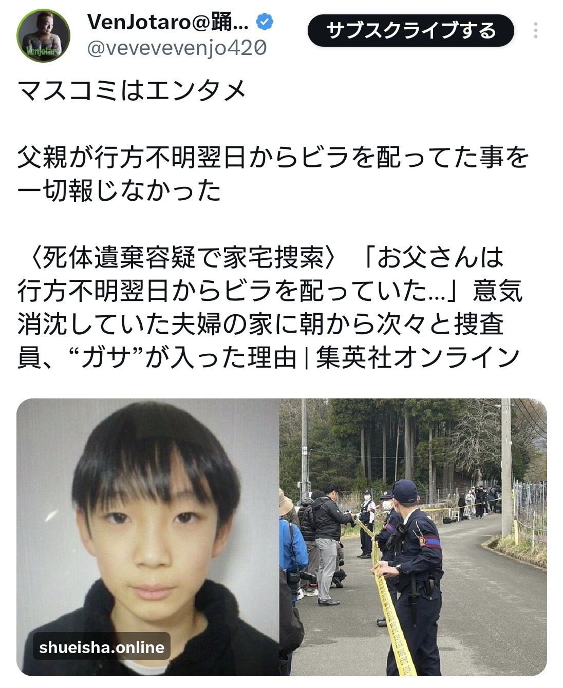 | … | 38無題Name名無し 26/04/15(水)09:49:09 IP:115.36.*(commufa.jp)No.4398202+ 1776214149537.jpg-(17000 B) 死亡した推定時期が03/21〜31、03/26に車で学校の近くまで送ったという親本人の「確実」な証言があり03/26〜31は「確実」に生きていたから推定と符合するねw |
