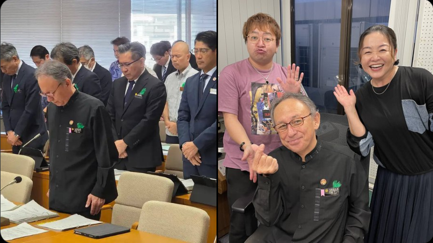 玉城知事は午後5時過ぎに海岸を訪れ、砂浜にあった岩に花束二つを手向け、手を合わせた。