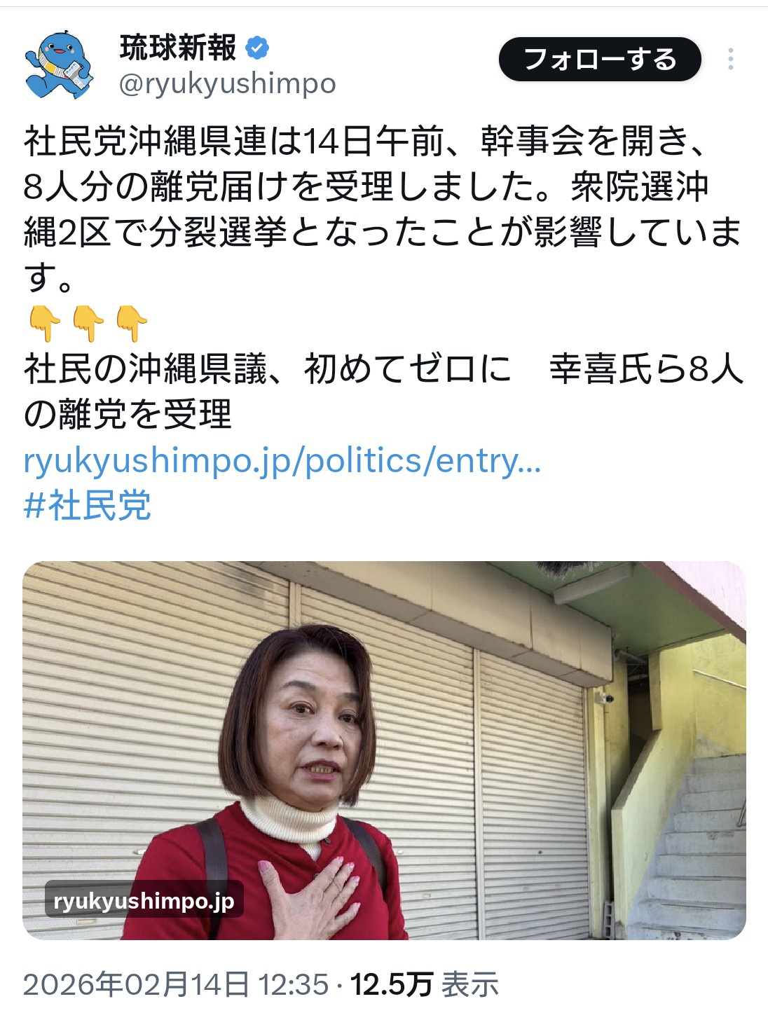 | … | 6無題Name名無し 26/02/11(水)19:51:07 IP:49.109.*(spmode.ne.jp)No.4391943+>中核に鞍替えした新垣と当てつけて社民がら出馬した瑞慶覧の得票足したら、当選した自民の宮崎の得票数をわすか740超えてるんだから |