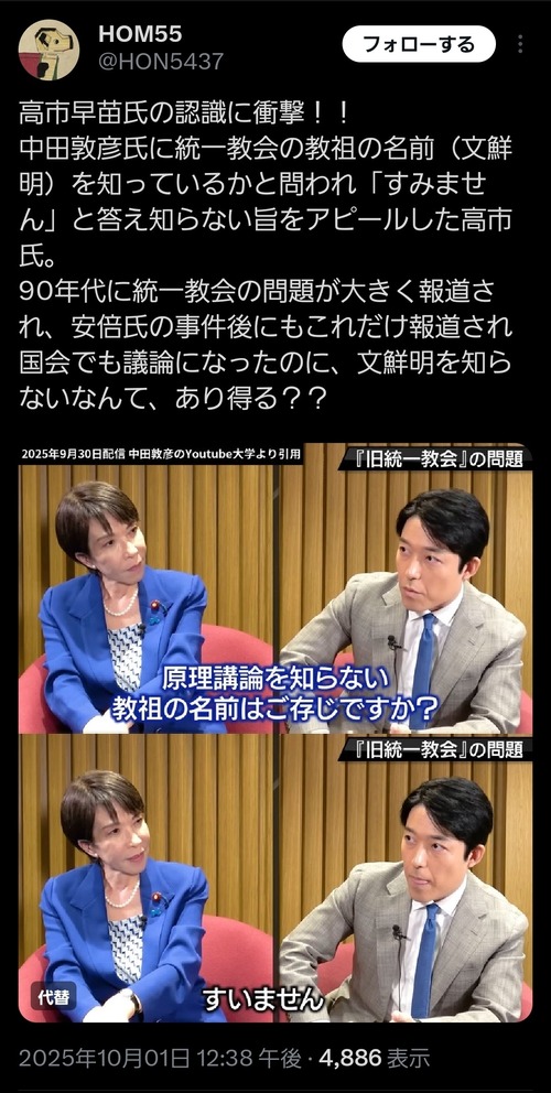 … | 1無題Name名無し 25/10/09(木)17:33:08 IP:153.191.*(ocn.ne.jp)No.4380414+「旧統一教会をめぐっては、’22年の安倍晋三元首相銃撃事件以降、安倍氏が過去に教団トップの韓鶴子氏に対して『敬愛を表する』と話すビデオメッセージを送っていたことなど、教団側と、自民党をはじめとする日本の政党の所属議員との接点が問題視されてきました |
