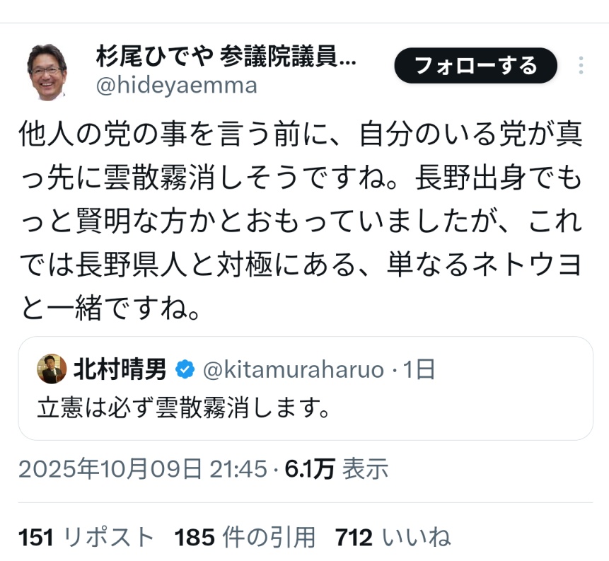 … | 4無題Name名無し 25/10/10(金)07:54:27 IP:153.190.*(ocn.ne.jp)No.4380533そうだねx3麻生閣下の忠告を聞かないからこんなことになる。 |
