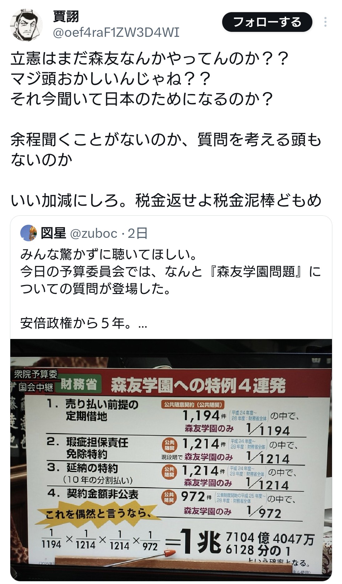 | … | 33無題Name名無し 25/11/13(木)08:20:40 IP:59.132.*(au-net.ne.jp)No.4384006そうだねx1>ちなみに、現役官僚から「質問通告2日前のルールを守っていないことが多い議員」として名前が多く挙がったのは、「森ゆうこ」「小西ひろゆき」「蓮舫」「福山哲郎」「枝野幸男」(以上立憲民主党)、「塩川鉄也」「山添拓」(以上共産党)の各氏でした。 |