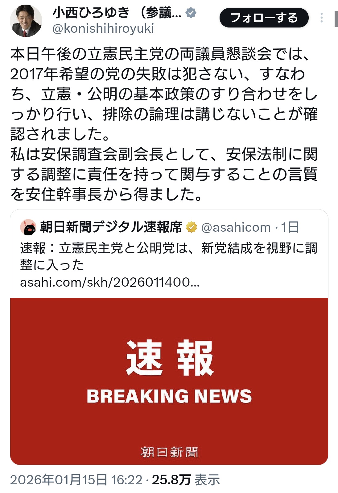 | … | 31無題Name名無し 26/01/16(金)12:29:49 IP:106.155.*(au-net.ne.jp)No.4389388そうだねx2 1768534189769.jpg-(268454 B) >だったら何で公明党の副代表と立憲の代表とで会見で言ってる事が違うんだよ?すり合わせをしっかり行ってこれなのか? |