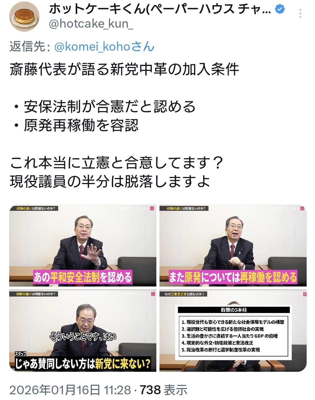 立憲との新党結成を模索する公明党の斉藤鉄夫代表は15日、高市首相が決断した衆議院の解散を「全く理解ができない」と批判した上で、党所属議員らに「中道勢力の結集を」と理解を求めた。レス24件省略。全て読むには返信ボタンを押してください。