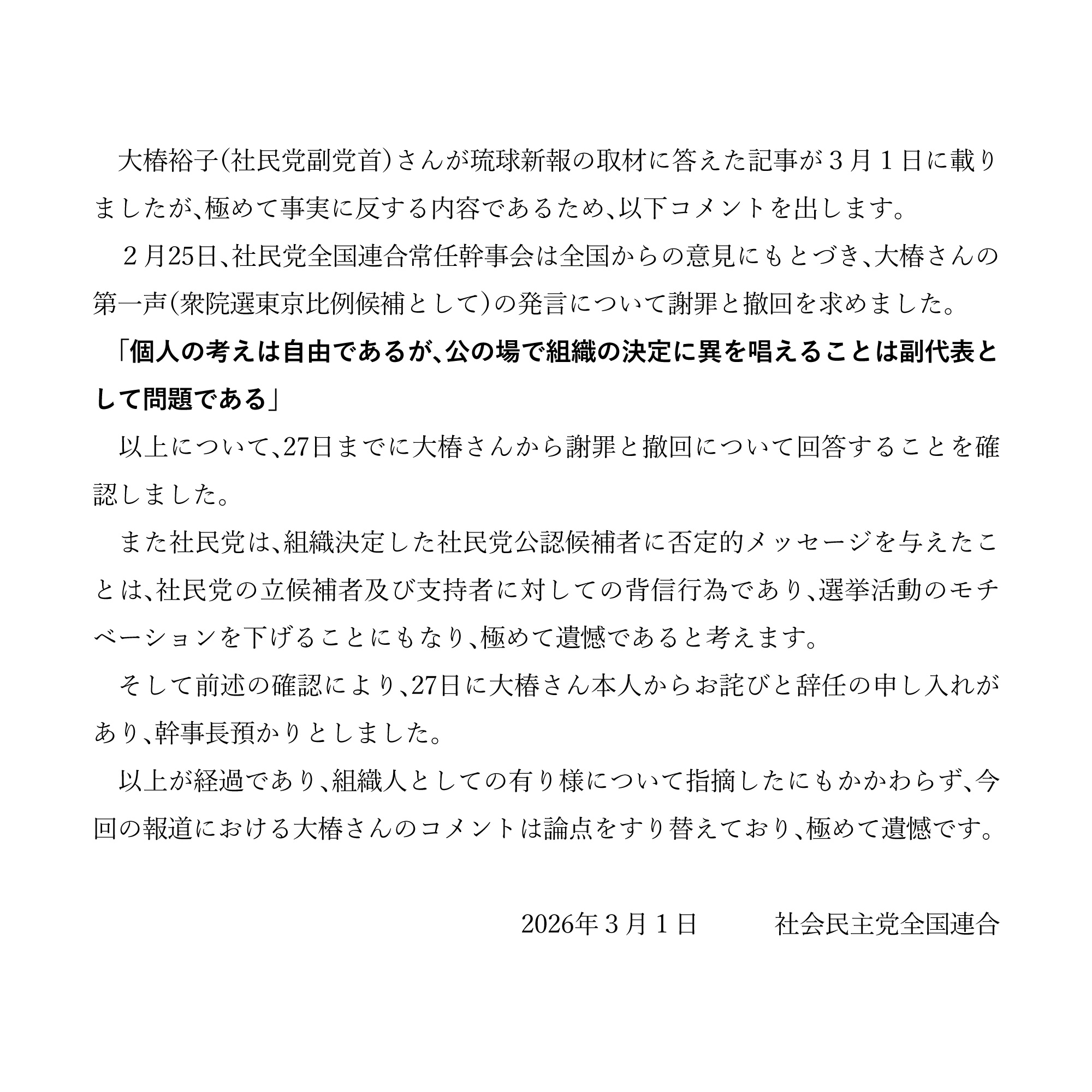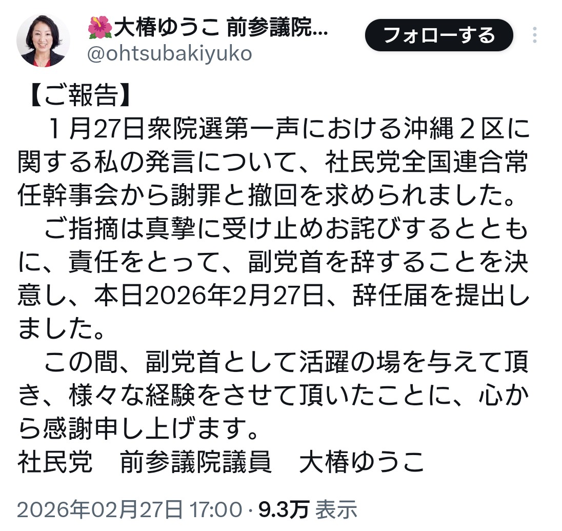 | … | 16無題Name名無し 26/03/02(月)08:08:57 IP:59.132.*(au-net.ne.jp)No.4393800+ 1772406537514.jpg-(465158 B) 大椿の発言に社民党も激おこ、沖縄の選挙結果が変わってた可能性がそこそこ高かったんで余計にお荷物感が増したな |