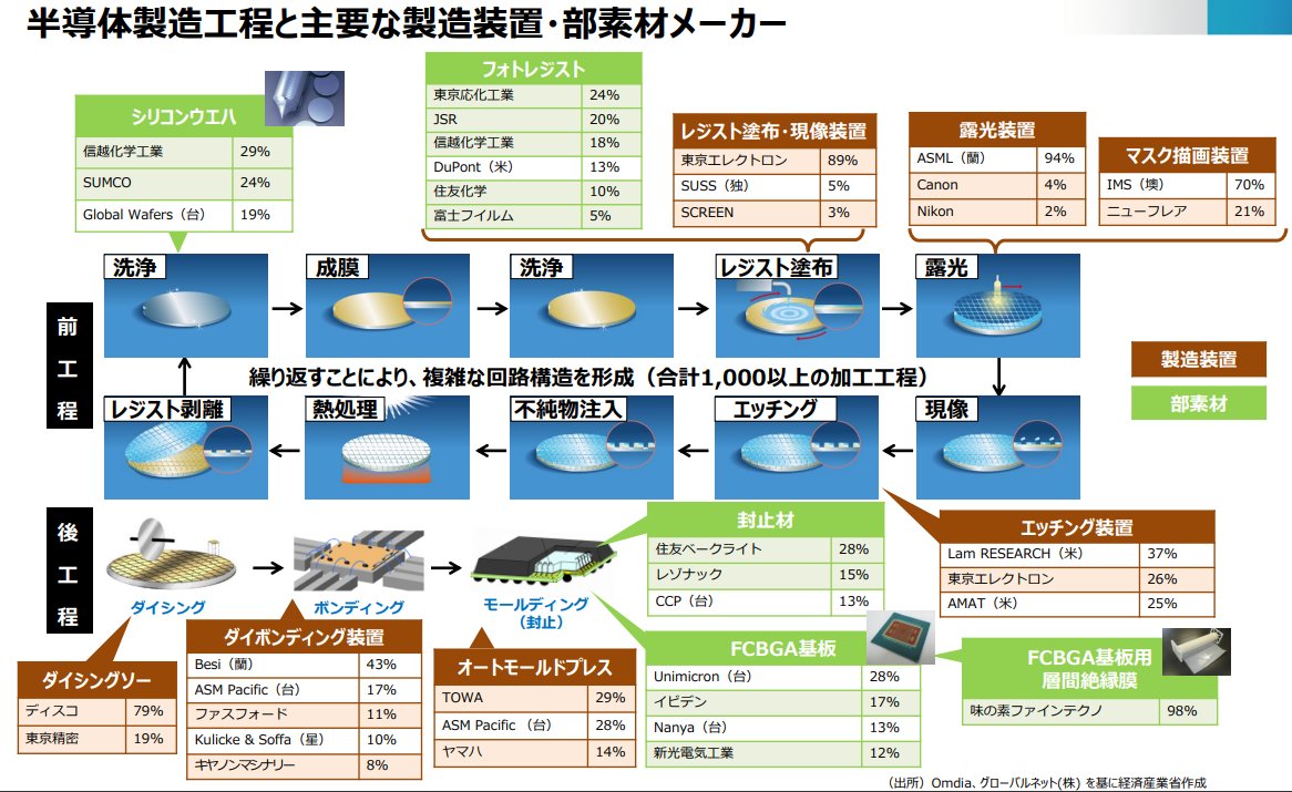 シリコンウエハ、80%、フォトレジスト、75%等々、日本が独占。