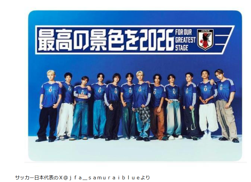 | … | 7無題Name名無し 25/11/15(土)15:52:39 IP:153.246.*(ocn.ne.jp)No.4384240+ 1763189559669.png-(550340 B) 人気グループを起用した当初のビジュアルだったが発表後、SNSなどで色の配置などが韓国の太極旗に似ているとの指摘が出ていた。日本協会はこの日、公式SNSで変更を発表。「日本サッカー協会(JFA)は11月10日にJFAオフィシャルWEBサイトに掲載した『サッカー日本代表「最高の景色を2026」アンバサダー』のキービジュアルを変更することといたしました。JI BLUEの皆さんとの取り組みの意図や目的をより正確にお伝えしていくために検討を重ねた結果です。サッカー日本代表が『最高の景色を2026』を実現するために引き続きご支援をよろしくお願いします」と説明した。 |