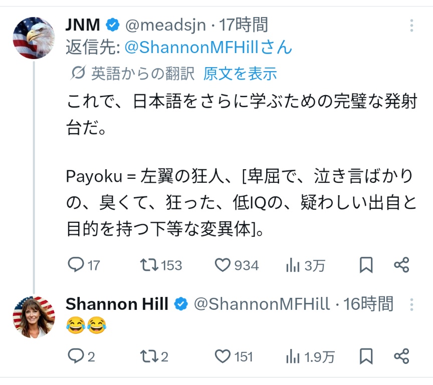 | … | 8無題Name名無し 26/04/03(金)18:19:22 IP:133.106.*(ipv4)No.4397118そうだねx1>わざわざ「猿真似」をアピールしてまで自国民の民度の低さをバラしたくないという |