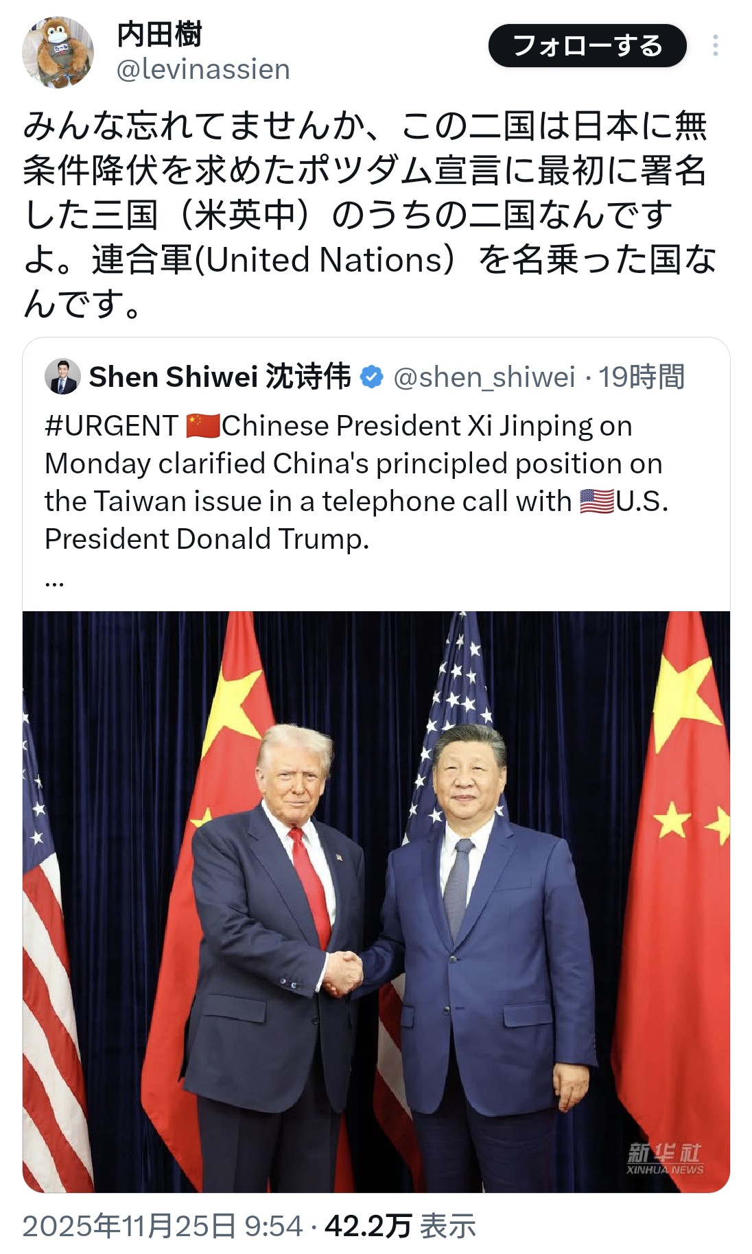 | … | 31無題Name名無し 25/11/25(火)20:06:30 IP:133.209.*(mesh.ad.jp)No.4385382そうだねx6>そもそもポツダム宣言の署名国は「中華民国」で |