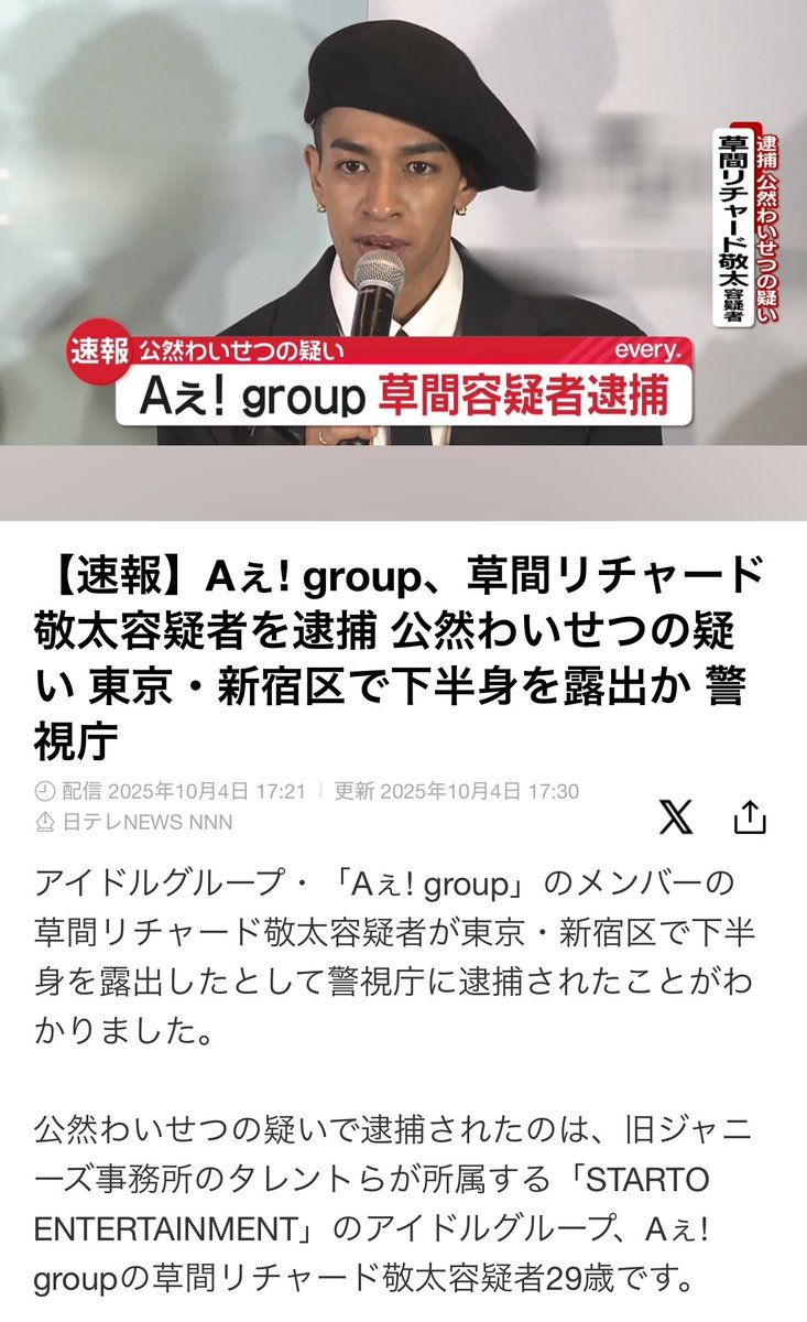 アイドルグループ・「Aぇ! group」のメンバーの草間リチャード敬太容疑者が東京・新宿区で下半身を露出したとして警視庁に逮捕されたことがわかりました。レス11件省略。全て読むには返信ボタンを押してください。