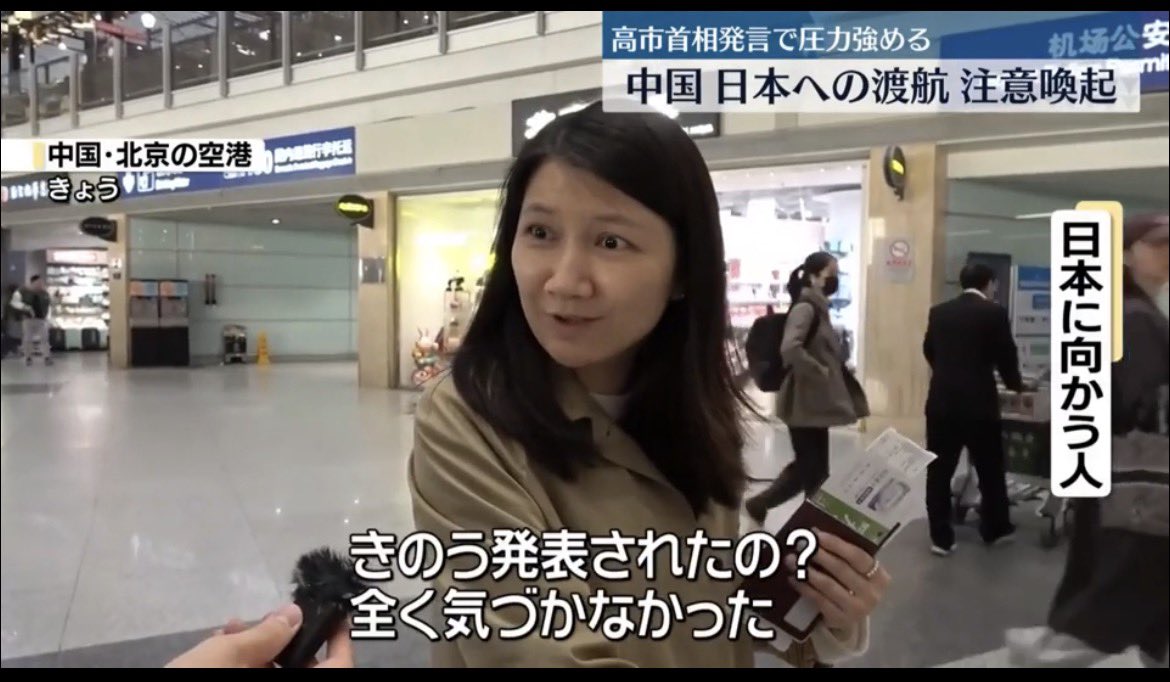 台湾有事に関する高市早苗首相の国会答弁をめぐり、中国外務省が14日夜、中国国民に日本への渡航を避けるよう呼びかけた。日中間の人的交流の雰囲気が著しく悪化したため、中国人の身体と生命の安全に「重大なリスク」が生じたとしている。日本旅行に向かう市民はどう受け止めているのか。一夜明けた15日朝、上海の浦東空港を訪ねた。
