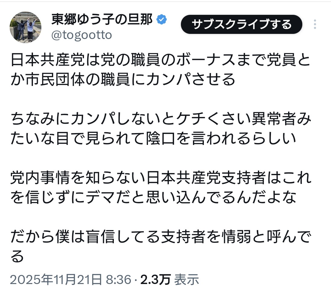 | … | 18無題Name名無し 25/11/21(金)16:03:46 IP:106.155.*(au-net.ne.jp)No.4384923そうだねx1 1763708626471.jpg-(177835 B) へぇ…党職員のボーナスを党員や団体組織のカンパで出してるんですか |