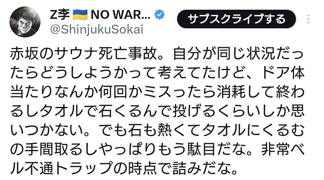〈赤坂・超高級サウナ2人死亡〉「非常ボタンを押した形跡もあった」外れたドアノブ…タレントが広告塔、月額39万コースも「シェフがつくる食事も飲み物も全て無料でした」(集英社オンライン) - Yahoo!ニュースレス36件省略。全て読むには返信ボタンを押してください。