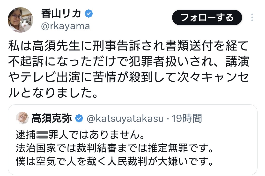| … | 12無題Name名無し 25/11/10(月)07:29:55 IP:112.68.*(eonet.ne.jp)No.4383633+これで実刑になるんだったら文春とか立憲民主党議員とか何なの?と思うけどね |