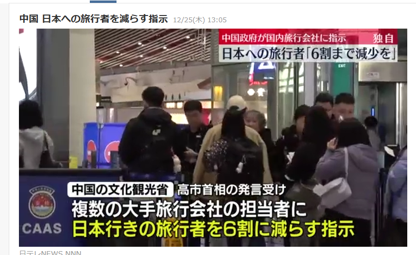 日中関係の緊張が続く中、中国政府が国内の旅行会社に対し、日本への旅行者を6割にまで減少させるよう指示していたことが新たに分かりました。レス1件省略。全て読むには返信ボタンを押してください。