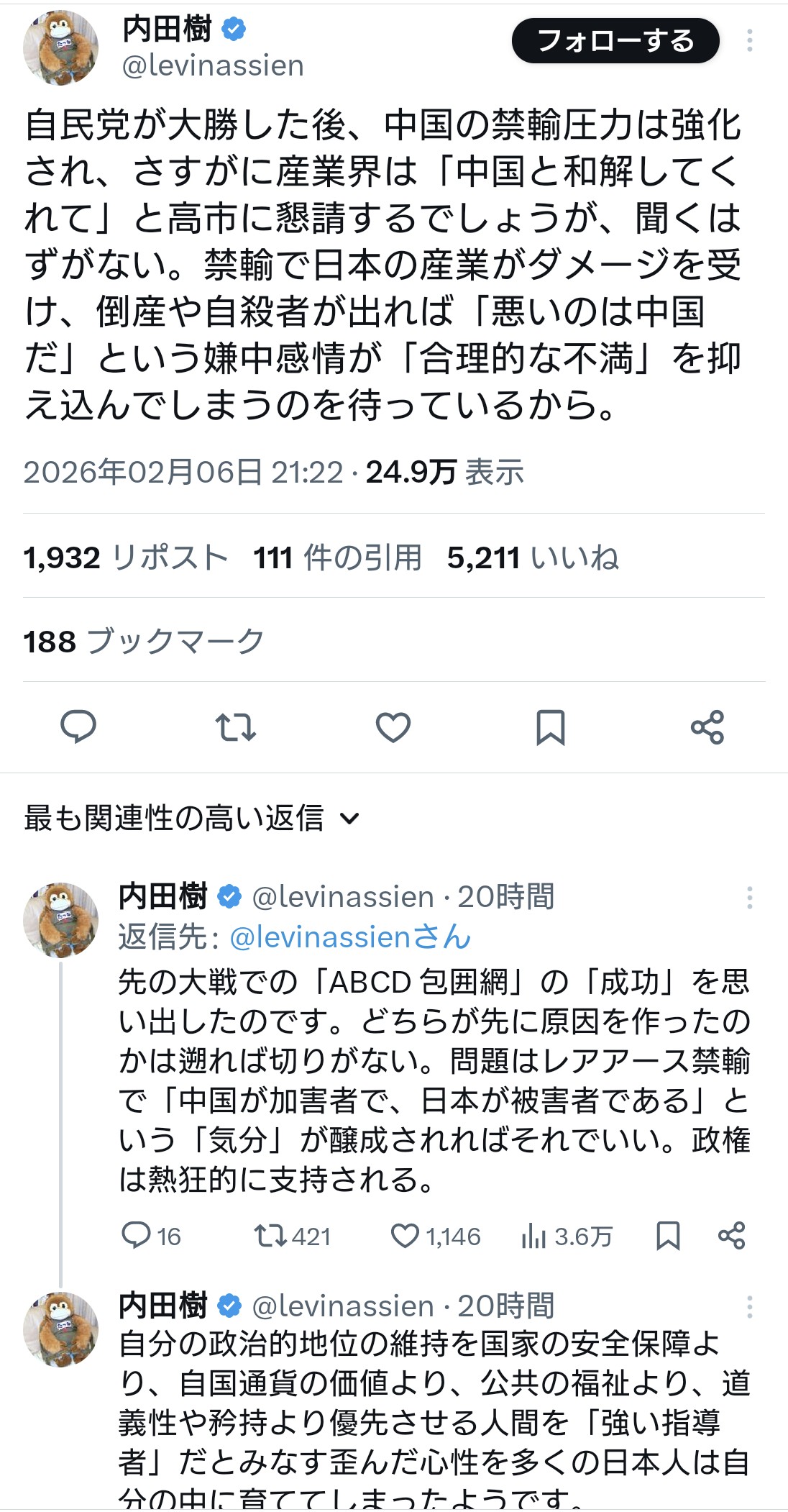 | … | 23無題Name名無し 26/01/18(日)14:23:43 IP:153.207.*(ocn.ne.jp)No.4389588そうだねx3中国の強み(悪い意味で)は人命人権を無視した生産性の高さしかないからな |