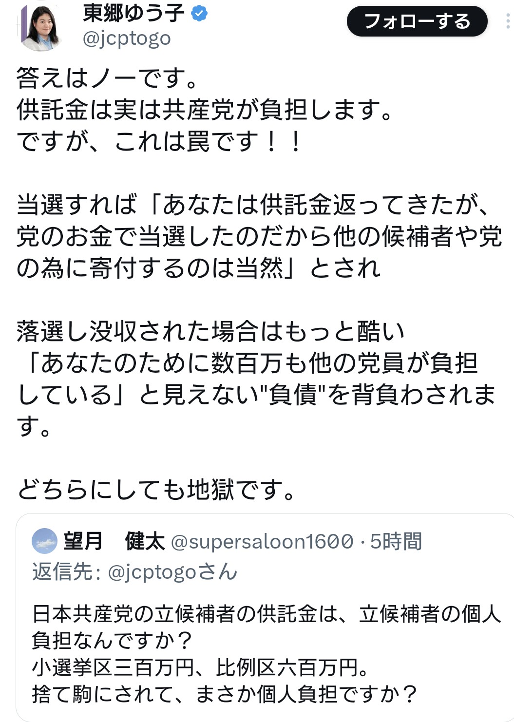 | … | 16無題Name名無し 26/02/10(火)12:16:24 IP:106.146.*(au-net.ne.jp)No.4391757+ 1770693384681.jpg-(259234 B) >昨日の選挙特番観て思ったんだけど共産党の連中ってかなり色んな選挙区に候補出してるけどほとんどの奴が得票率1ケタのカスばっかなんだが供託金は何人分戻ってくるんだろうね |