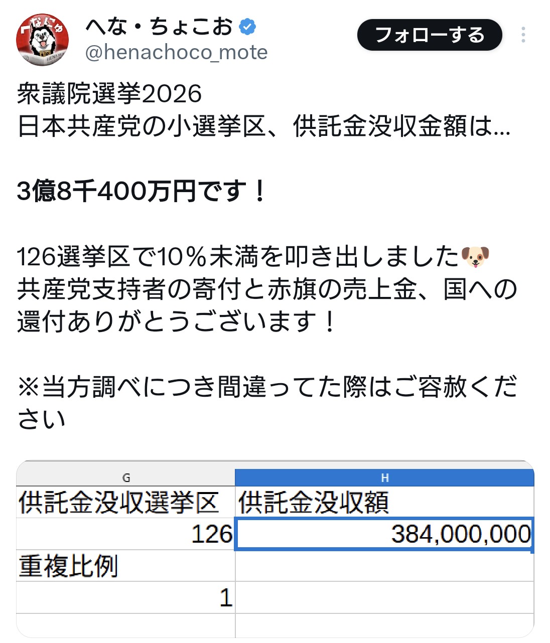 | … | 23無題Name名無し 26/02/10(火)22:19:00 IP:180.20.*(ocn.ne.jp)No.4391819+ 1770729540901.jpg-(207312 B) >昨日の選挙特番観て思ったんだけど共産党の連中ってかなり色んな選挙区に候補出してるけどほとんどの奴が得票率1ケタのカスばっかなんだが供託金は何人分戻ってくるんだろうね |