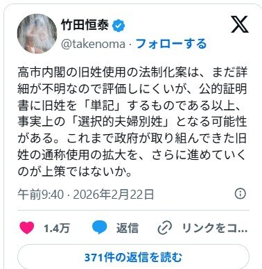 | … | 5無題Name名無し 26/02/24(火)21:42:39 IP:115.36.*(commufa.jp)No.4393259+これって竹田が言うように実質的に「選択的夫婦別姓」つかがちがちの「夫婦別姓」w |