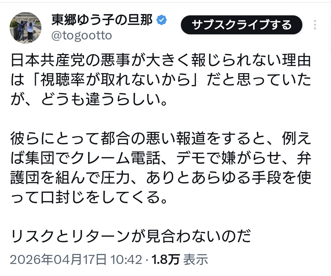 | … | 15無題Name名無し 26/04/17(金)11:59:30 IP:27.91.*(au-net.ne.jp)No.4398417そうだねx2 1776394770507.jpg-(173859 B) 今回の件や共産党関連(しばき隊等)の話があまり報じられない本当の理由 |