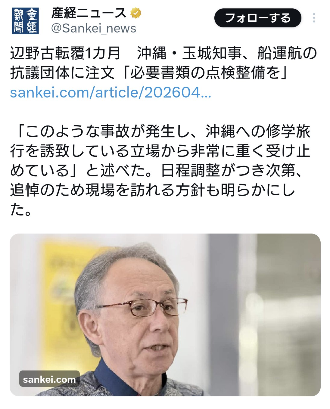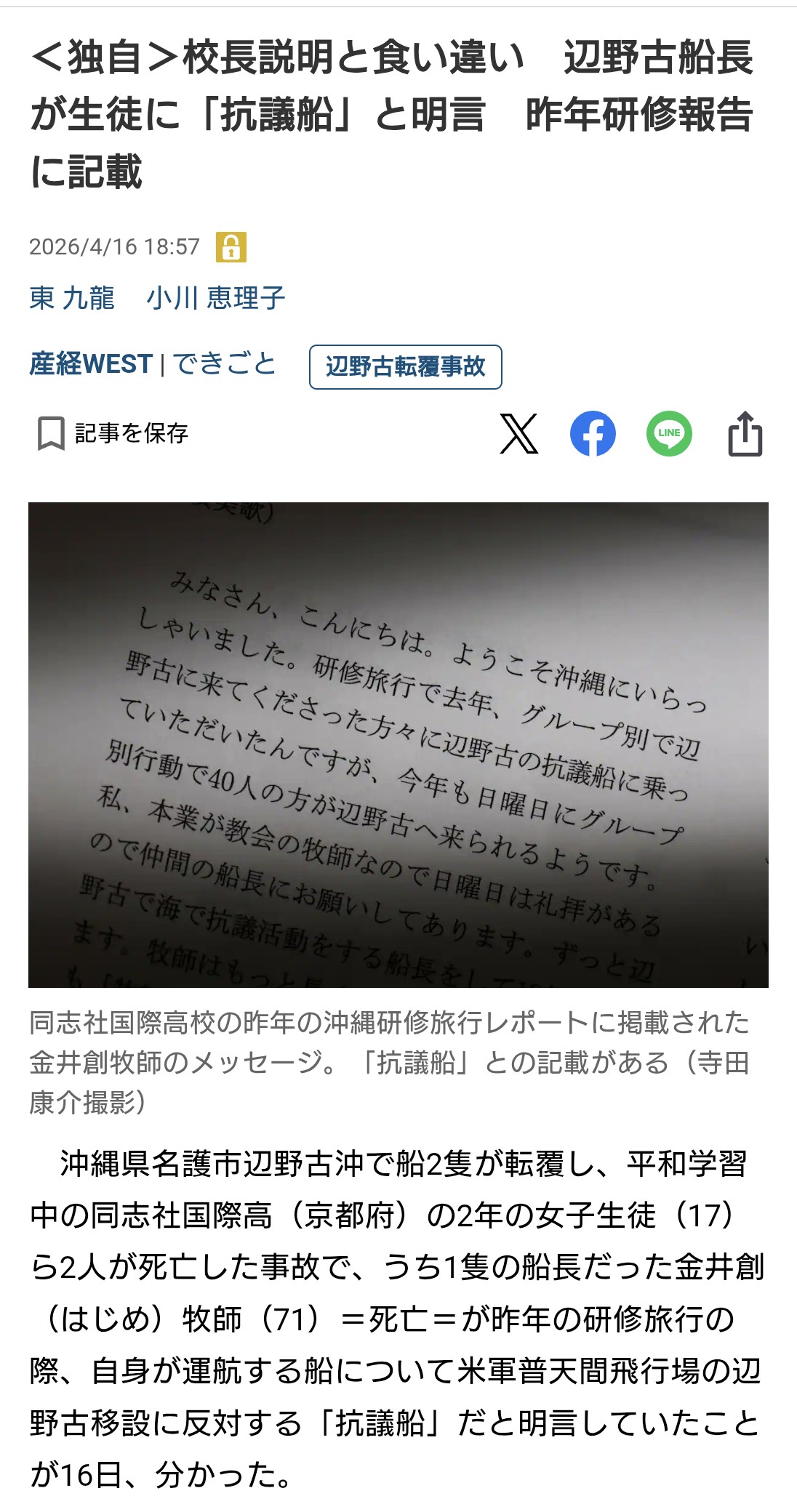 | … | 4無題Name名無し 26/04/18(土)07:53:37 IP:219.107.*(mesh.ad.jp)No.4398517+辺野古沖抗議船転覆事故報道及び知床遊覧船沈没事故報道比較 |