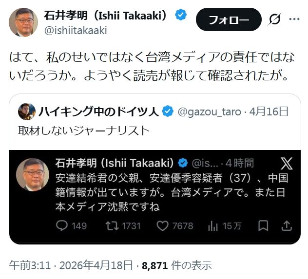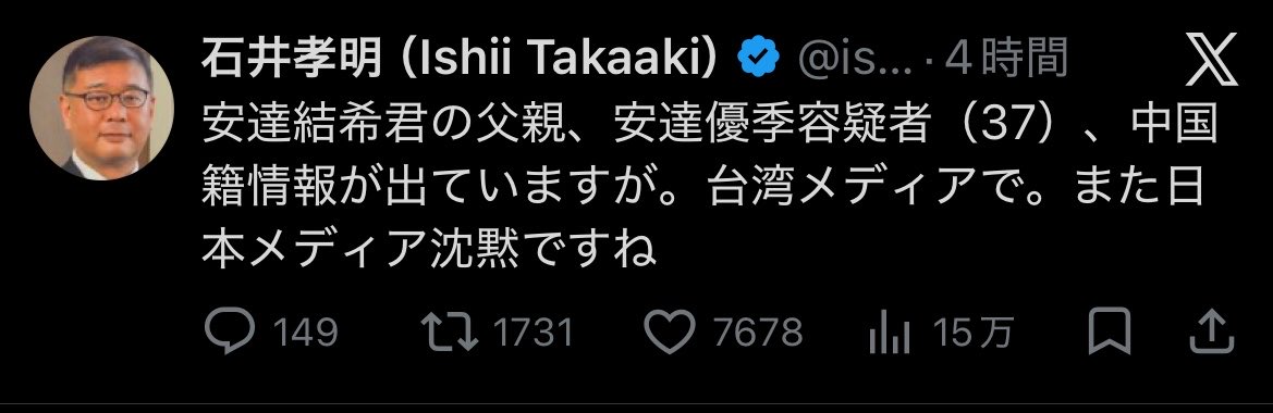 X(旧ツイッター)上では15日、事件について報じた台湾のニュース動画が、日本の政治などの話題を発信するアカウントから投稿された。動画には「中国籍の継父が関与した可能性」と中国語のテロップがついており、この投稿は860万回以上表示されている。