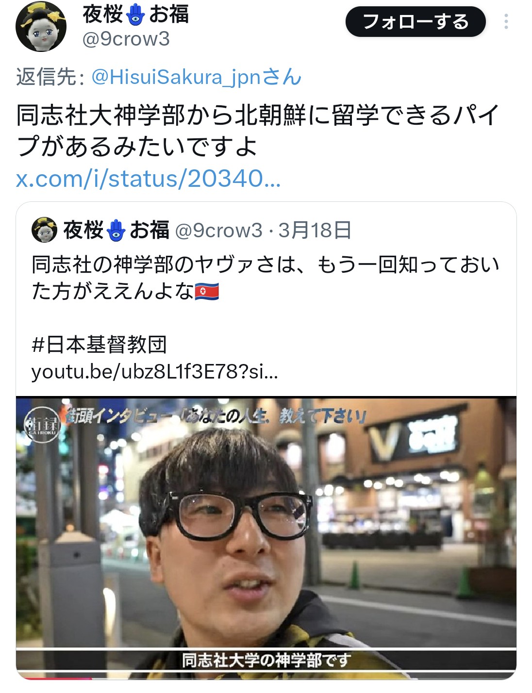 | … | 3無題Name名無し 26/04/21(火)11:28:52 IP:106.155.*(au-net.ne.jp)No.4398790+ 1776738532127.jpg-(262824 B) 高校の方は知らんけど大学の方は神学部から北朝鮮留学出来るミラクルコースが存在するらしいですよ |