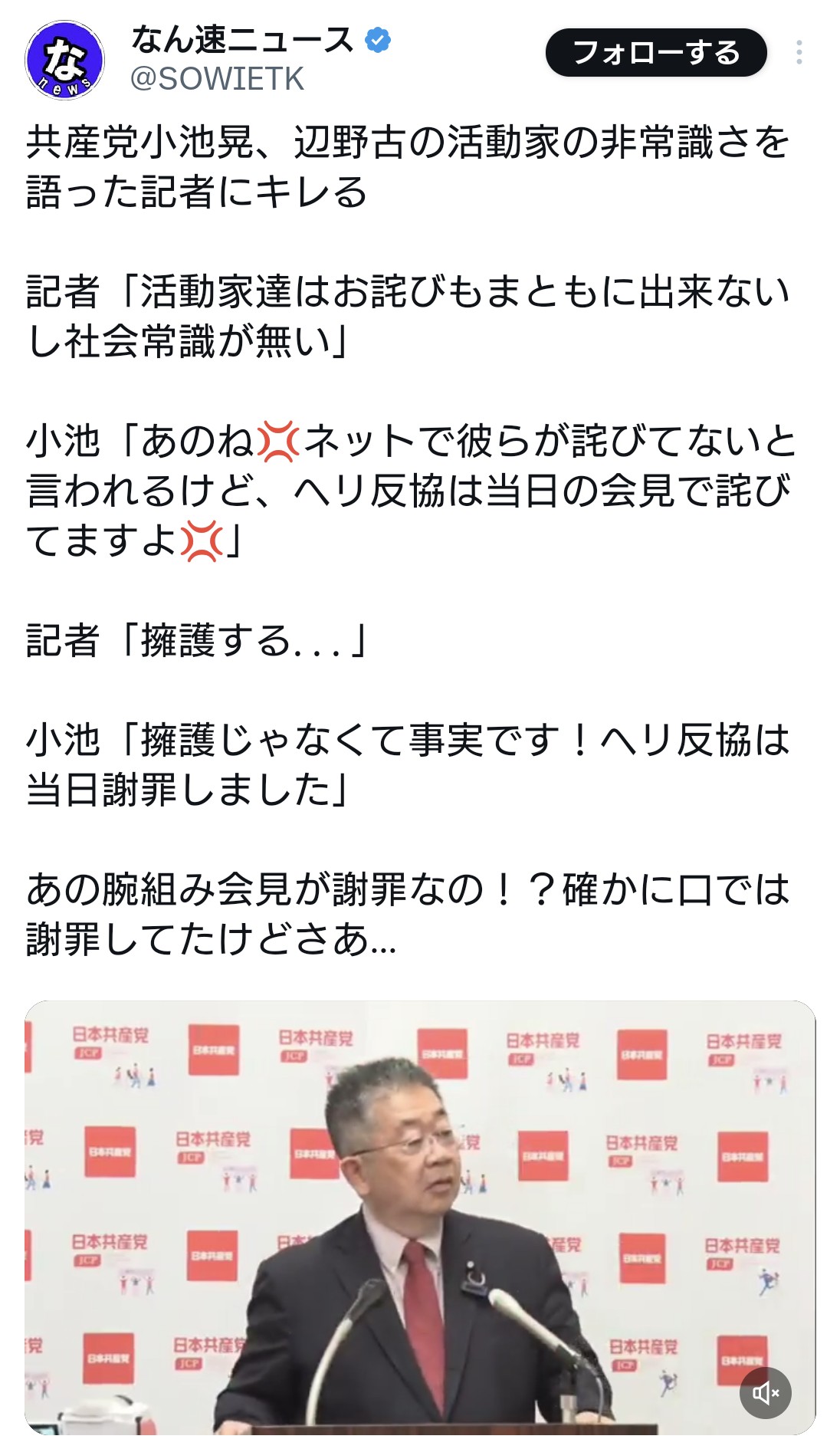 | … | 1無題Name名無し 26/04/28(火)15:07:12 IP:59.129.*(dion.ne.jp)No.4399461+ 1777356432953.jpg-(280399 B) その後の記者の質問では、「協議会」について、「やっぱり普通の人から見たら、おわびもまともにできない、取り返しのつかないことをやっているのに比べて、お詫びとか、そういうものが社会常識とか駆け離れてるように見える」と指摘される場面があった。共産党の初動についても「要するに高校生が死んじゃったんですよ?だからそのギャップというのは、なんか偏向教育がどうだ、じゃなくて、この組織自体まずゼロにしよう、ぐらいの話がなかったら、私は共産党が失っているものがすごく大きいと思う」と批判を受けた。 |