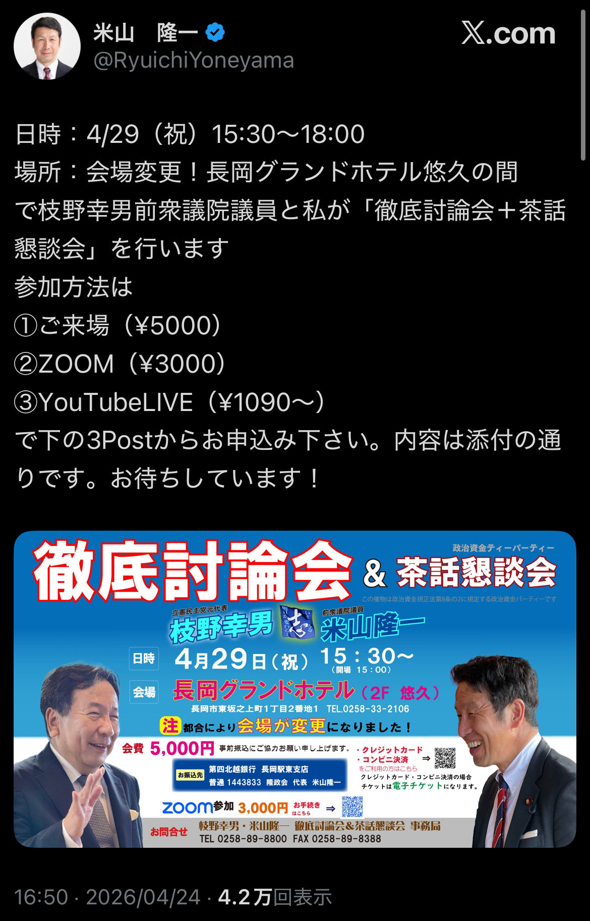 | … | 1無題Name名無し 26/04/28(火)15:20:34 IP:59.132.*(au-net.ne.jp)No.4399464+ 1777357234563.jpg-(352770 B) 落選メンバーの元党員達が金集めに必死で草、YouTubeの有料(かどうかは知らんし興味も無いけど多分有料なのでは?)チャンネルはまだ分かるけどZOOMで金取んのはボッてますやん |