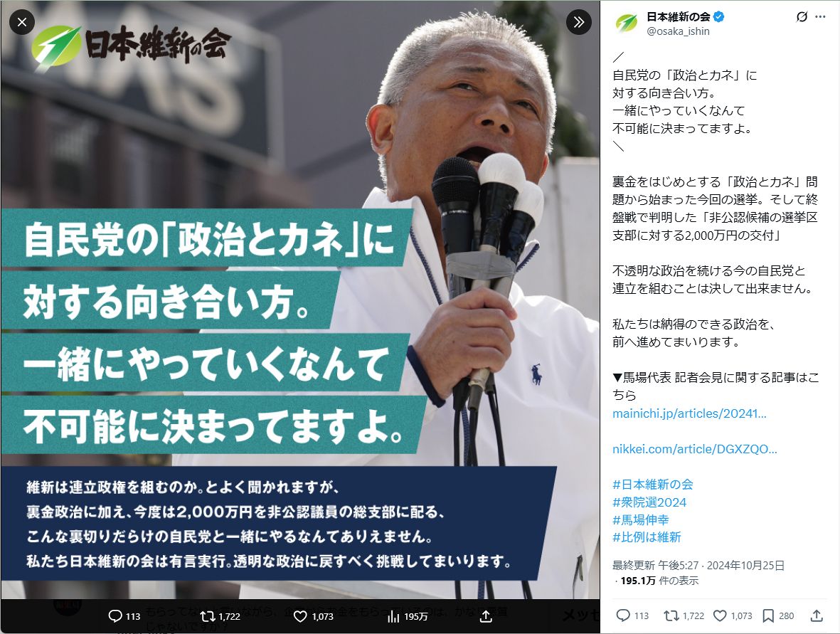 | … | 2自維連立合意で“政治とカネの問題”は「棚上げ」 副首都構想を優先か…Name名無し 25/10/24(金)18:54:48 IP:153.191.*(ocn.ne.jp)No.4382081+ 1761299688029.jpg-(193306 B) 自民党は、規制するのではなく透明化、見えるようにしましょうという消極的な姿勢を示しています。これに対し、国民民主と公明党は規制強化を目指しています。立憲・維新などは「原則禁止」を訴えており、自民と維新の姿勢にはかなり溝があるように思います。 |