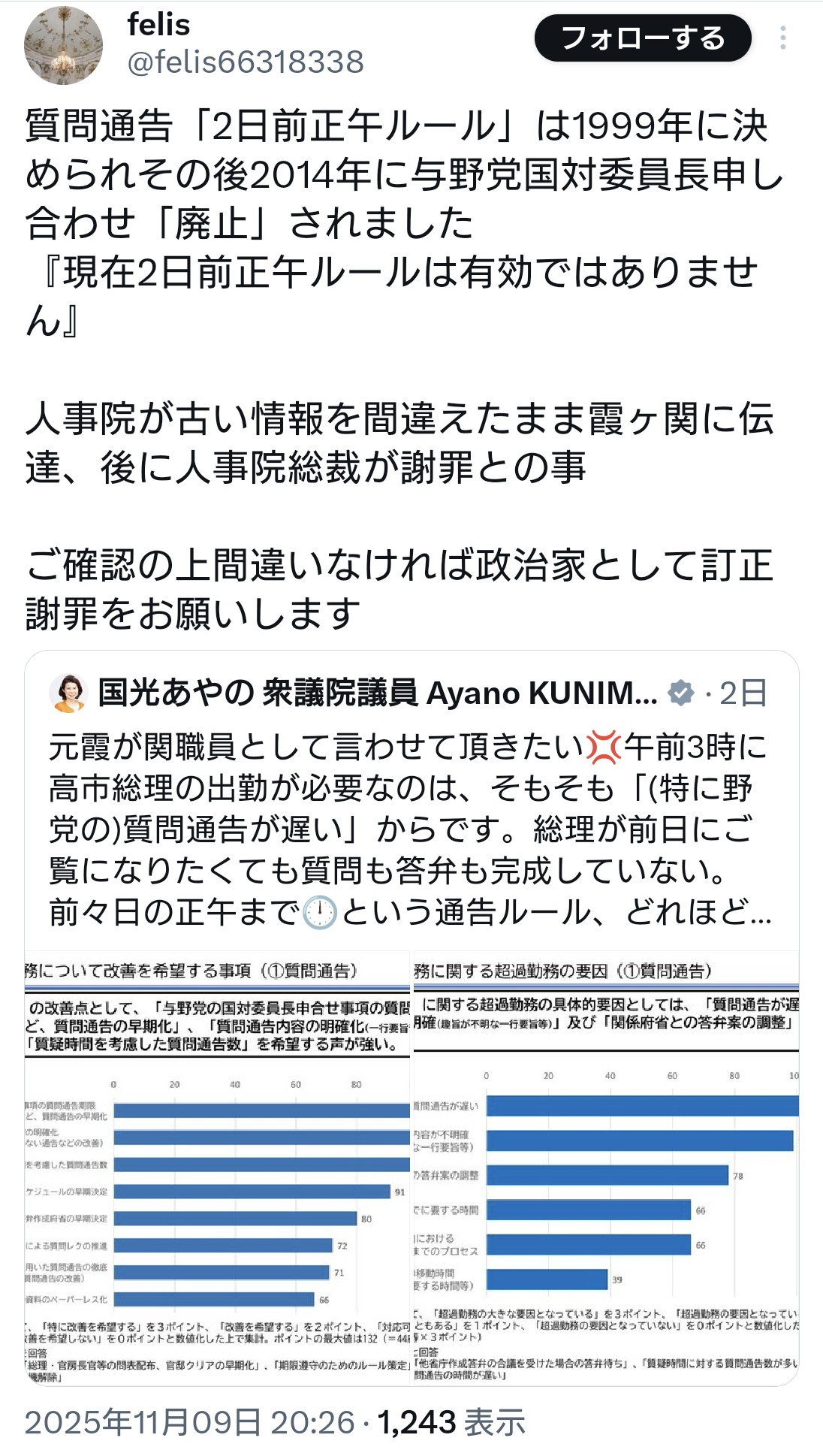 | … | 16無題Name名無し 25/11/10(月)18:53:31 IP:153.191.*(ocn.ne.jp)No.4383717そうだねx1>モリトモとかで官僚の過労死が問題になって、その負担の原因が民主党の直前質問だったという話よ |