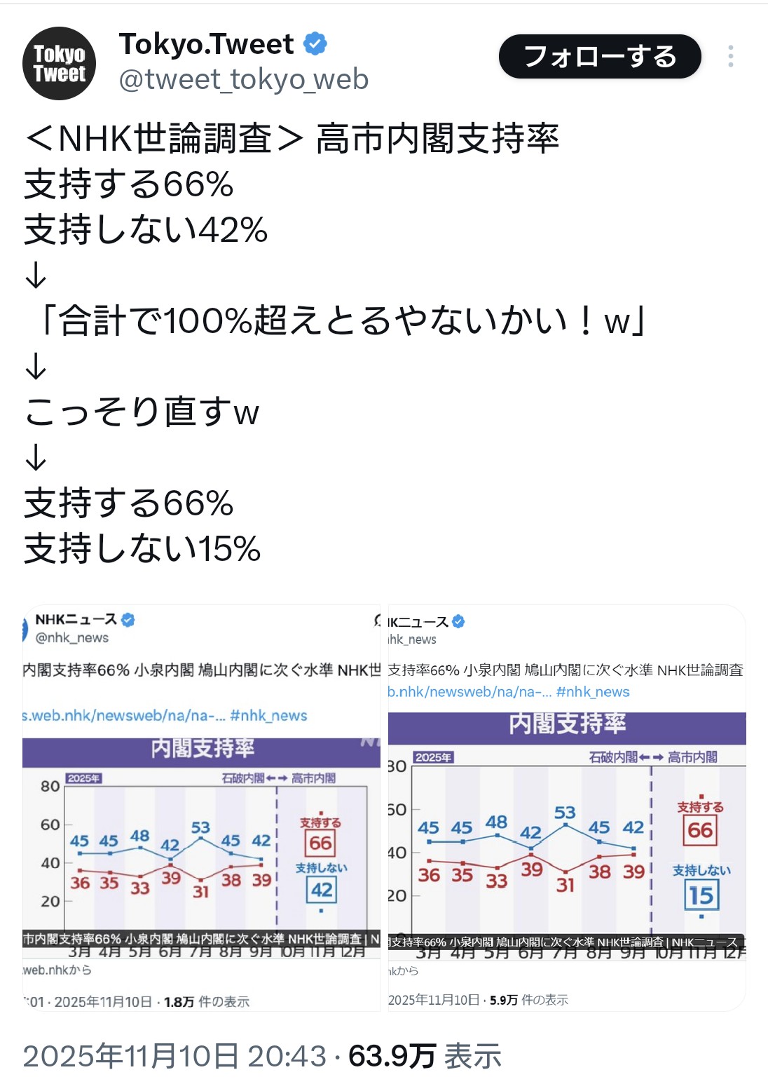 | … | 2無題Name名無し 25/11/11(火)10:47:04 IP:106.146.*(au-net.ne.jp)No.4383770+ 1762825624717.jpg-(238475 B) 【悲報】NHKさん、世論調査アンケートで合計すると100%以上になる事に気付いて大幅な修正をしてしまう |