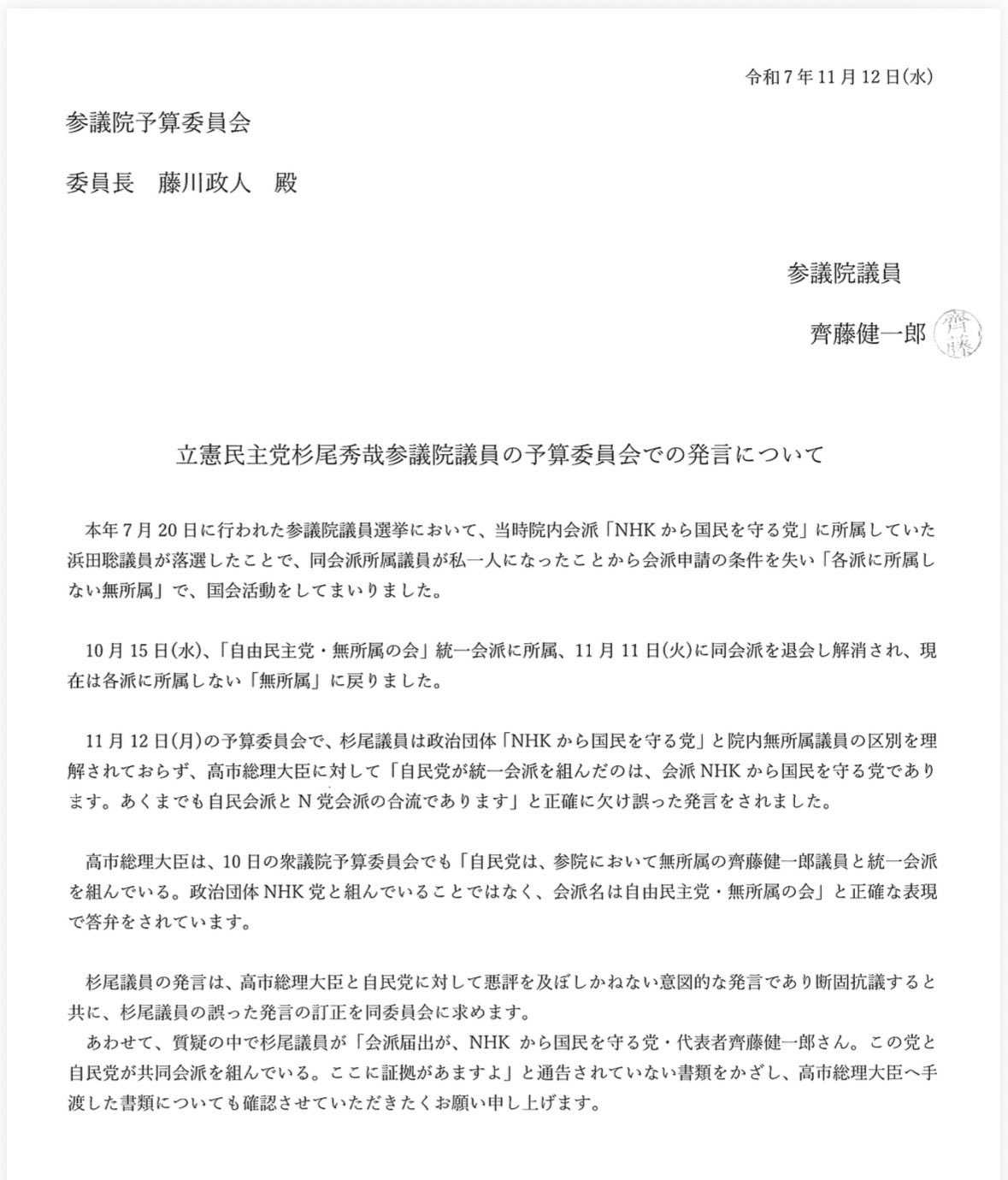 立憲民主党の杉尾秀哉参院議員は12日の参院予算委員会で、名誉毀損の疑いで兵庫県警に逮捕された立花孝志容疑者(58)が党首を務める政治団体「NHKから国民を守る党」に所属する斉藤健一郎参院議員と、自民党が参院で統一会派を組んだことに関する高市早苗首相の対応を問題視した。