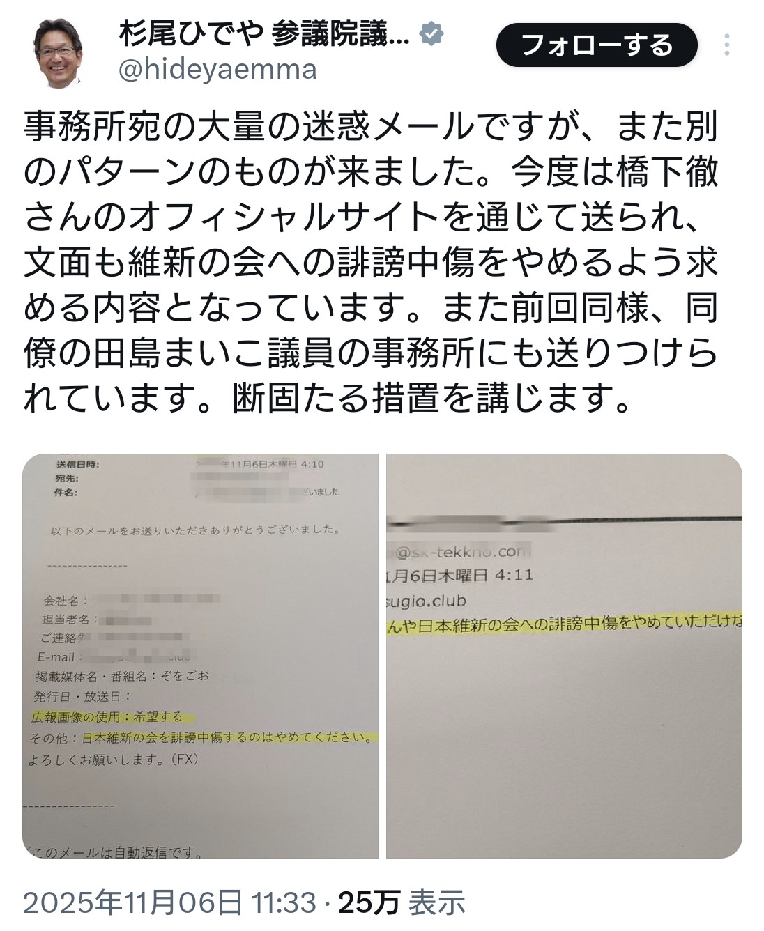 | … | 8無題Name名無し 25/11/14(金)04:51:29 IP:106.128.*(au-net.ne.jp)No.4384074+ 1763063489201.jpg-(148134 B) 7月の参院選で浜田が落選したので |