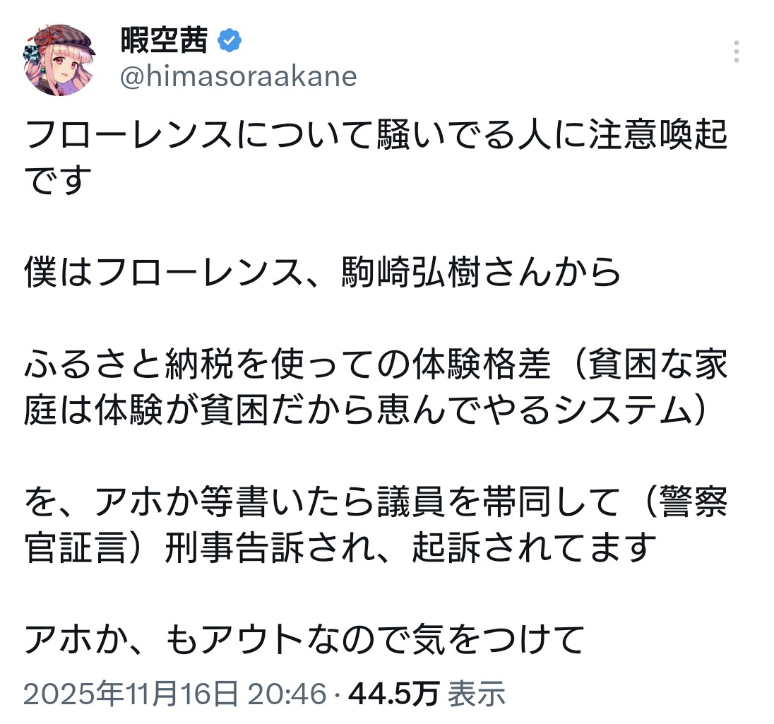 | … | 3無題Name名無し 25/11/16(日)21:09:03 IP:153.137.*(ocn.ne.jp)No.4384374そうだねx5>「政治活動の自由や表現の自由が最大限守らなければいけないのは大前提としてあるが、だからといってその過程でだれかを傷つけたり、虚偽の犬笛を吹いて多くの人から攻撃をさせるということをやった。そういうことが、いいはずはないんですよね」 |