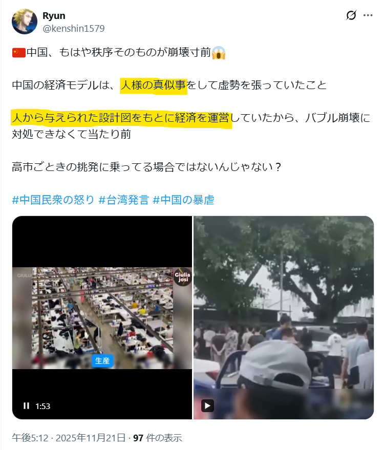 | … | 5無題Name名無し 25/11/23(日)13:04:52 IP:133.175.*(vectant.ne.jp)No.4385112+>中国は秩序そのものが崩壊寸前の状況 |