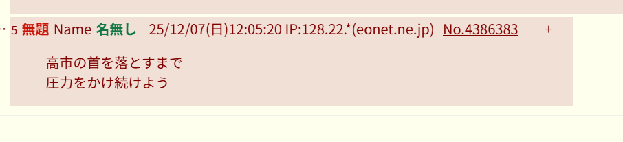 | … | 5無題Name名無し 25/12/07(日)12:05:20 IP:128.22.*(eonet.ne.jp)No.4386383+高市の首を落とすまで |