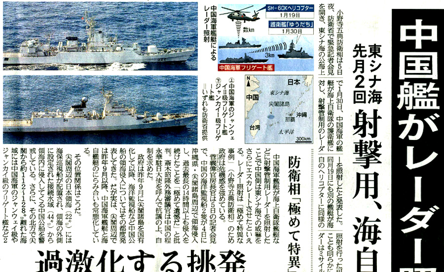 中国軍機から自衛隊機がレーダー照射を受けた事案の公表は初めて。防衛省によると、1回目のレーダー照射は6日午後4時32分頃から35分頃まで行われた。2回目は午後6時37分頃から7時8分頃まで、別の自衛隊機に対して行われた。