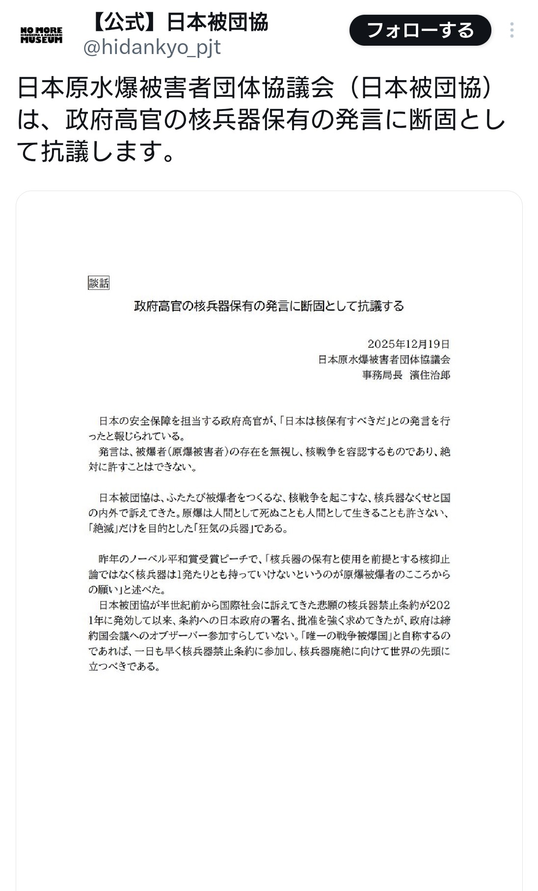 | … | 1無題Name名無し 25/12/21(日)10:03:26 IP:59.129.*(dion.ne.jp)No.4387423+ 1766279006815.jpg-(26265 B) そのうえで「戦犯国である日本の手中に核兵器まで握られる場合、アジア諸国の頭上に恐ろしい核の惨禍が降り注ぎ、人類が大災害に直面することになるということは、過去の日本による侵略の歴史が如実に証明している」などと唱えた。 |