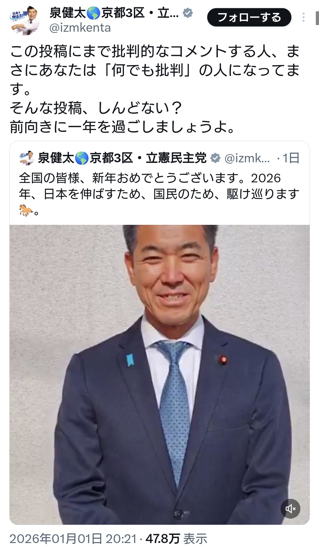 | … | 6無題Name名無し 26/01/03(土)10:52:26 IP:114.155.*(ocn.ne.jp)No.4388282そうだねx2 1767405146538.jpg-(284348 B) まぁ、新年早々前代表が盛大にブーメランしちゃう党なんで… |