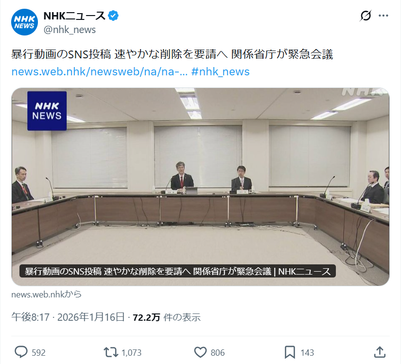 ◆暴行動画のSNS投稿 速やかな削除を要請へ 関係省庁が緊急会議