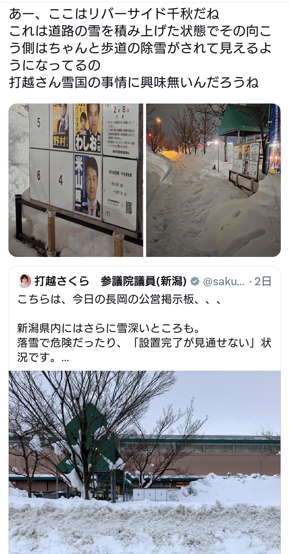 | … | 7無題Name名無し 26/01/29(木)13:39:12 IP:14.9.*(enabler.ne.jp)No.4390545+ 1769661552545.jpg-(572150 B) 中道の政治家が「雪に埋もれた選挙ポスター掲示板」 |