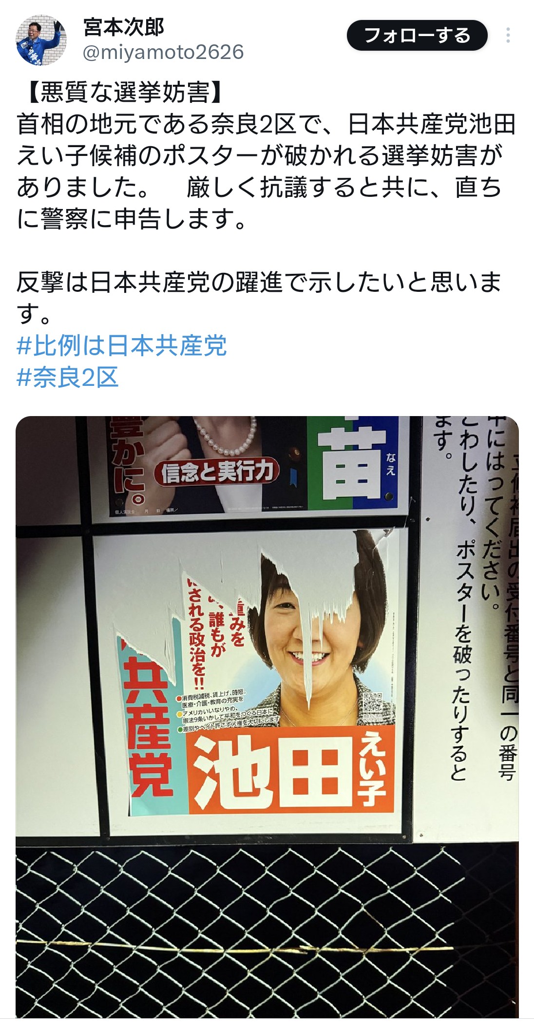 | … | 13無題Name名無し 26/01/29(木)16:52:27 IP:59.132.*(au-net.ne.jp)No.4390556+ 1769673147265.jpg-(459739 B) 一方その頃の共産党さん、高市の奈良2区で候補者のポスターが破られてると被害妄想 |