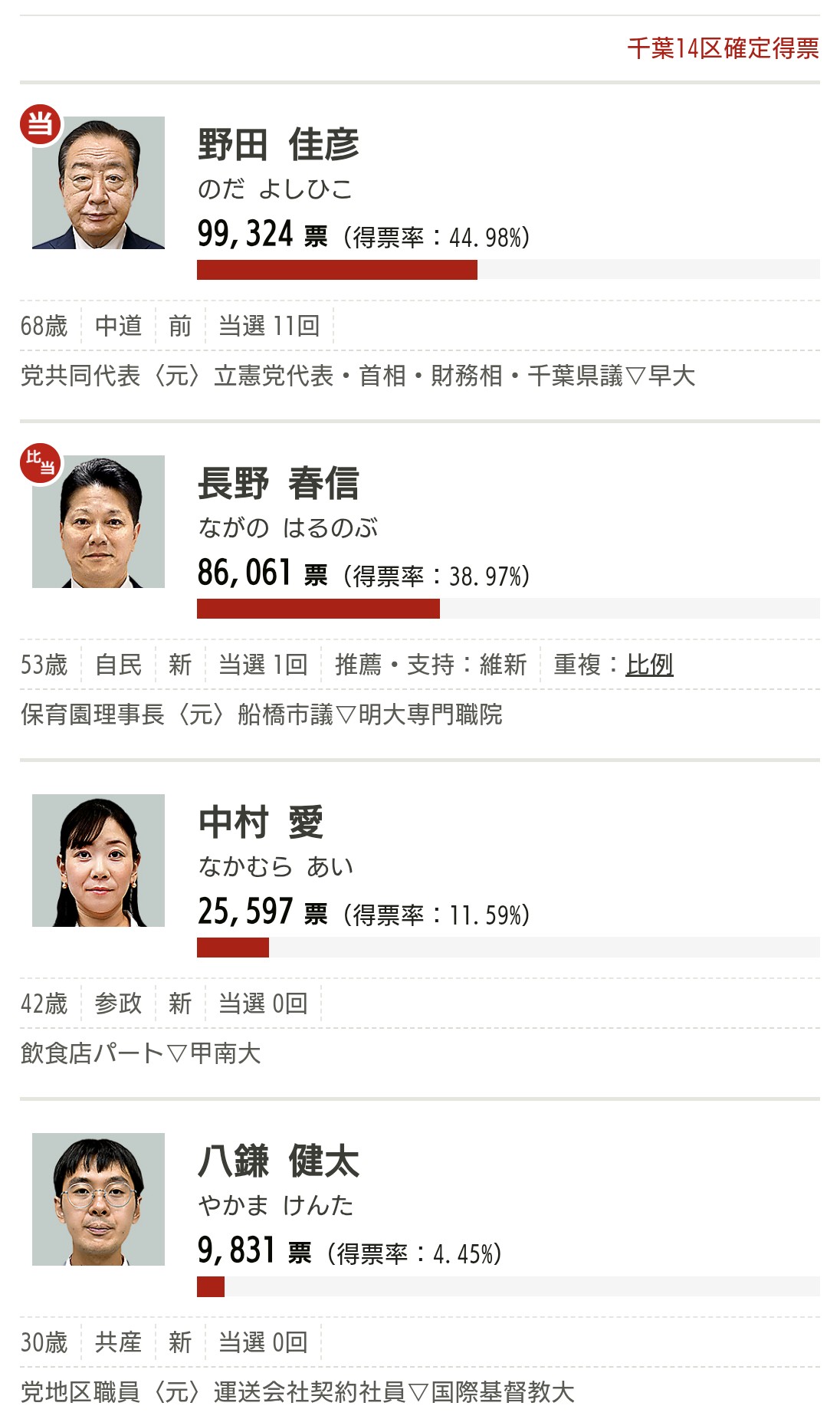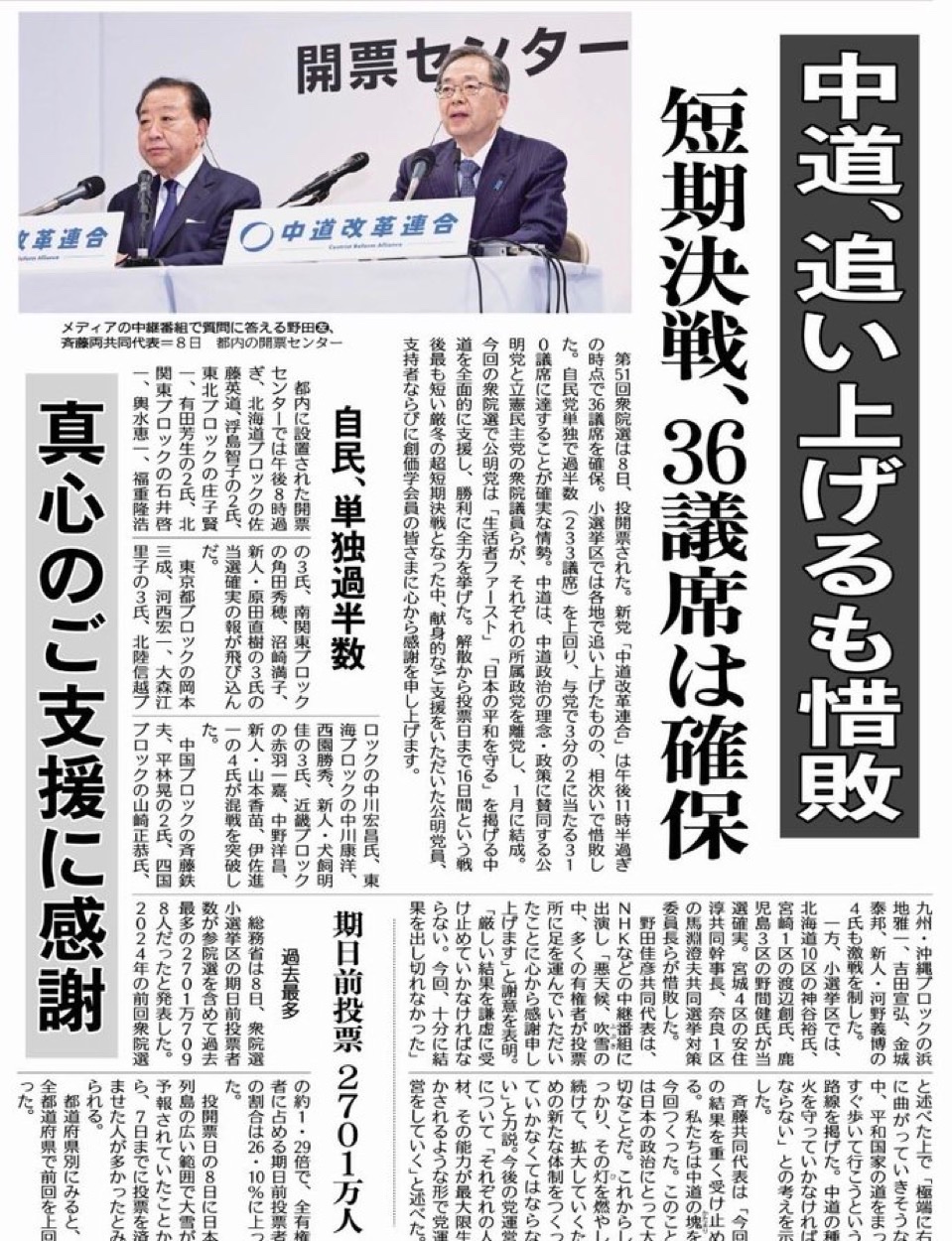 中道の小沢一郎氏や安住淳氏らも小選挙区で敗れ、比例復活できなかった。